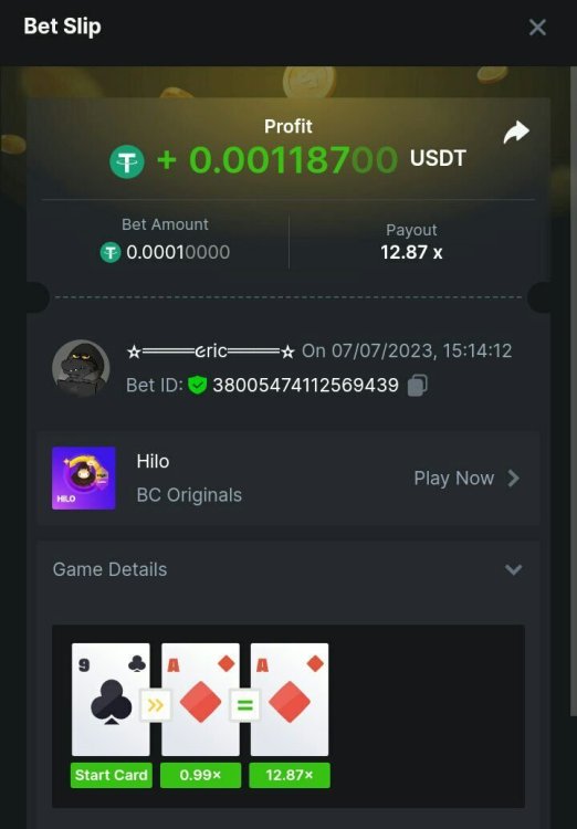 8. چالش 125 دلاری بازی هایلو / HiLo : چالش گرفتن بالاترین ضریب در بازی هایـــــلو و مجموع ضرایب ارسالے . هر ڪاربر مجاز به ارسال 2 اسڪرین شات مے باشد . مجموع 2 ضریب به اشتراڪ گذاشتہ شده ، به عنوان امتیاز ڪاربر در نظر گرفتہ خواهد شد : شرایط چالش حداقل پایہ شرط : مینیموم تمامے ارزها به جز جی بی - ✫ حداقل سطح ڪاربر : تمامے لول ها - ✫ حداقل امتیاز قابل قبول : 99 امتیاز مےباشد - ✫ : نڪات مهم ڪاربر مجاز بہ رد ڪردن ڪارتہا مے باشد .✪ از ارسال شاتہای اضافے و قدیمے برای هر ضریب ، خوددارے ڪنید .✪ ارسال لینڪ شرطہا بہ همراه شات اسڪـــرینہا الزامے مے باشد .✪ ادیت ریپلاے ها مجاز نمے باشد .✪ در صورت عدم رعایت قوانین فوق ،از چالش حذف شده و در صورت ارسال شات تڪراری ، آن ضریب لحاظ نخواهد شد .✪ در صورت تساوی امتیازات ، بازیڪنے ڪہ پایہ شرط اولیـــن شات ارسالے اش بیشتر باشد (از نظر دلاری) برنده خواهد بود . اگر در امتیاز و پایہ شرط ها هم مساوی باشند ، ڪسے ڪہ اولین شات خود را زودتر ارسال ڪرده است در رتبہ بندے بالاتر در نظر گرفتہ مے شود . ═══════ ◦ ★ ◦ ═══════ جوایز نفر اول : برنده 50 دلار نفر دوم : برنده 25 دلار نفر سوم : برنده 15 دلار نفرات چہارم و پنجم : نفری 6 دلار نفرات ششم تا یازدهم : نفری 3 دلار نفرات دوازدهم تا شانزدهم : نفری 1 دلار زمان پایان چالش : شنبہ 2 مہر / 24 سپتامبر ساعت 23:59 نمونه شرط ارسالی : https://hash.game/sd/?sd=10HXTS13ILFUOJ