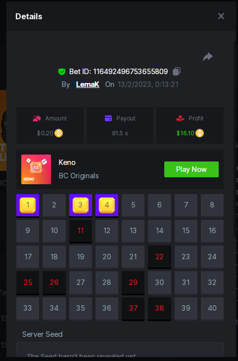 Admin BC_Jack Posted February 10, 2023 Admin Share Posted February 10, 2023 $1.5k Prestige Weekend Keno Challenge #68 DURATION: 10th FEB - 13th FEB 09:00 am UTC Greetings VIPs! Ending this week with another most loved game KENO! As to the new version of our prestige challenges this weekend we are excited to host the Keno and Keno Multiplayer challenge with prize pool of $1,500, duration of this challenge will be from 10th FEB - 13th FEB 09:00 UTC. Don't forget to read all terms below to find out how to participate in this event. Good Luck! What's the Challenge? Complete as many of the following 20 payouts on either KENO or KENO Multiplayer. Must be a exact multiplier. | 5.10x | 11x | 17x | 26x | 30x | 56x | 63x | 81.5x | 100x | 180x | 250x | 270x | 350x | 450x | 500x | 600x | 710x | 800x | 900x | 1000x Each payout you hit above counts as 1 point (Maximum 1 point for each payout). If there is a tie, the player with the higher average bet amount (in USD) shall be the winner. How to Enter To enter, copy the link of the bet you'd like to submit. Once you've copied it, paste it as a reply to this thread like so: Link: https://bc.game/#/sd/1135M13OA5PPG3 In the same post, upload a screenshot of your win by clicking the game ID WITH VIEW IN USD mode ENABLED (accessible at the bottom of dropdown menu for your wallet up top. This way, we can ensure that your bet indeed met the minimum requirement at the time of placing it: Link: https://bc.game/#/sd/1135M13OA5PPG3 Minimum Payouts Hit at least 3 payouts to qualify Minimum Bet Size $0.20 USD equivalent Eligible Coins All cryptocurrencies are eligible (excepting JB, and BCL) Available Prizes Positions 1st 2nd 3rd 4th 5th 6th-10th 11th-20th Bounty Prizes $500 $250 $125 $75 $50 $125 $125 $250 EXTRA BOUNTY Go an extra mile and get a share of this Bounty! To be a part of Bounty win 500x multiplier with $0.20 bet! Original rules apply with all minimum requirements. GENERAL TERMS There is no minimum level to participate in this event everyone is welcome to join. Minimum bet is $0.20 Please combine all of your hits together in a SINGLE post. Edit your existing post for additional hits, don't create a new post. Bets must be posted within 24 hours of placing bet in order to keep things fair for everyone. Bets must be made during the specified time window stated above. This thread will lock automatically when the time period is over. One (1) entry per household. Anyone found attempting to win multiple prizes will be disqualified from this challenge as well as all future challenges. Failure to follow instructions will result in your submission being null and void. By entering this challenge, you acknowledge that BC.Game has the final decision on results and placement. Payouts will be distributed after the event is finished. Please note that it could take up to 4 days after the completion of the event. 2 Link to comment Share on other sites More sharing options...