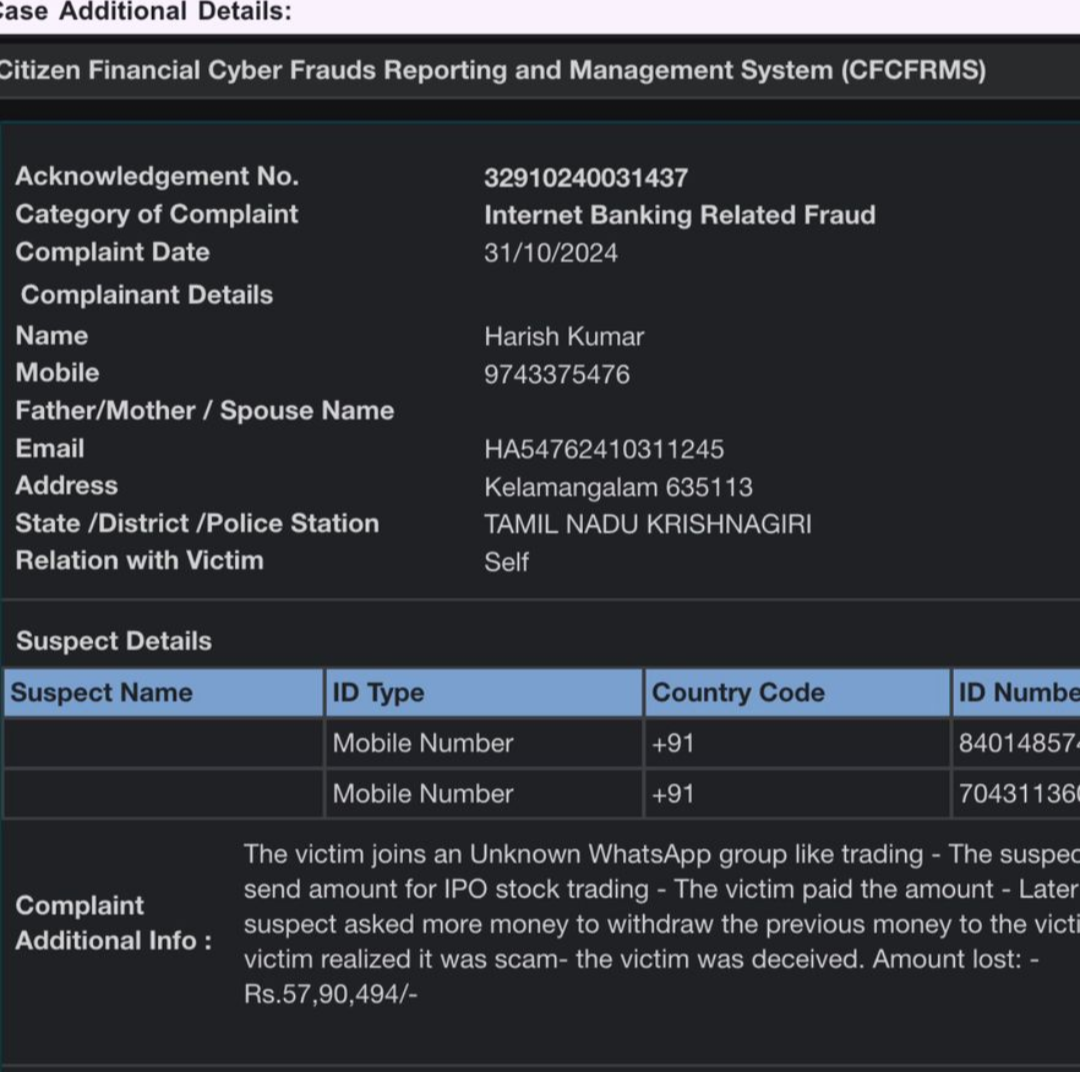 BCF_K_MANAGEMENTSCAM Posted January 1 Share Posted January 1 Case 1 Order Details: Withdraw Amount: 25000 INR Order ID: F-1847607437977800173 Status(f4): Success Fee: 0 INR Created Time: 1/11/2025, 10:19:20 pm Case 2 Order Details: Withdraw Amount: 10000 INR Order ID: F-1847607632385834428 Case 3 Order Details: Withdraw Amount: 50000 INR Order ID: F-184714 1698153024199 Link to comment Share on other sites More sharing options...